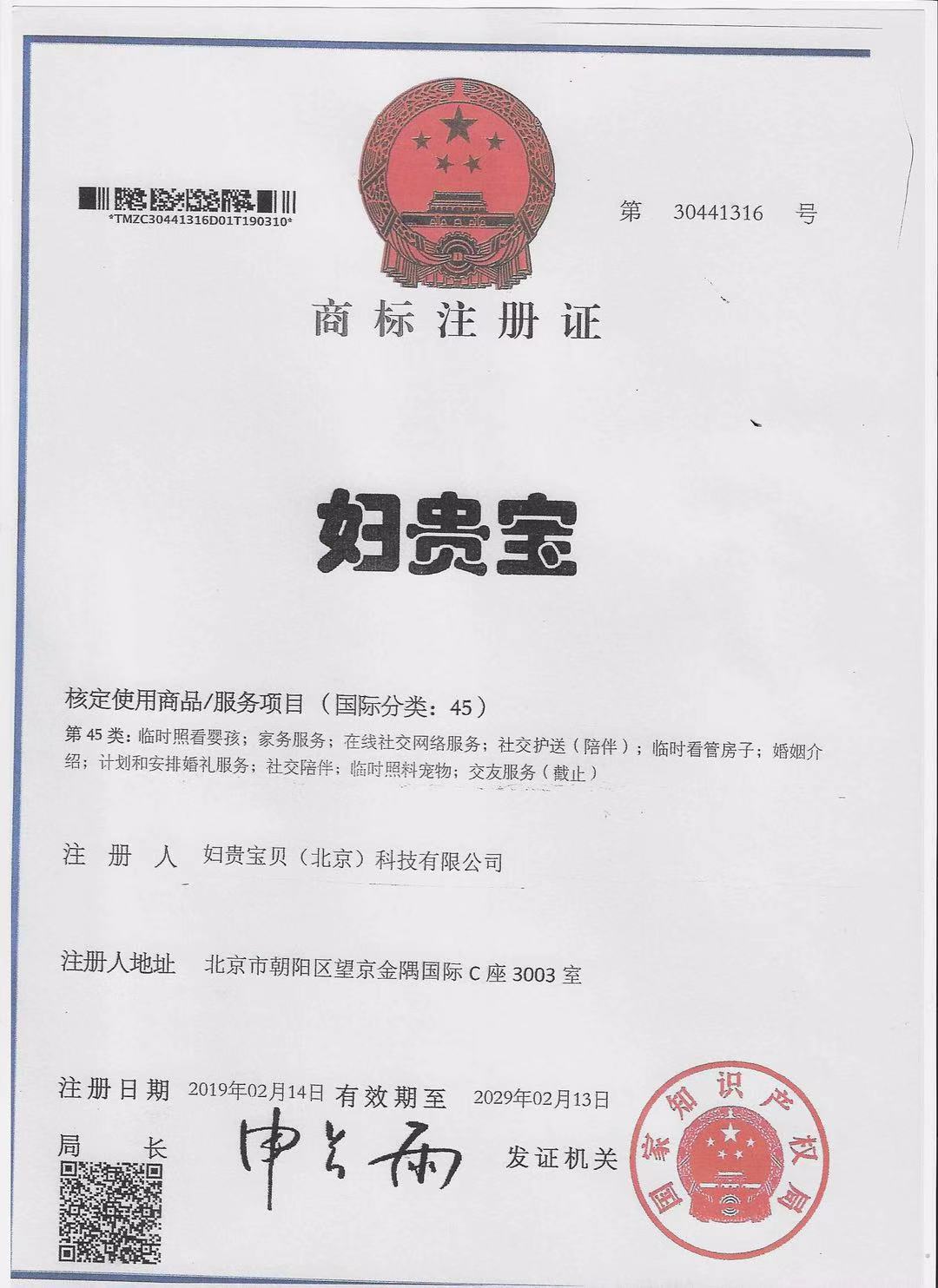 (因為我們在國家商標局注冊了國際分類45類家庭服務品牌{婦貴寶}有自己品牌商標的企業,是受到國家知識產權法律保護的)