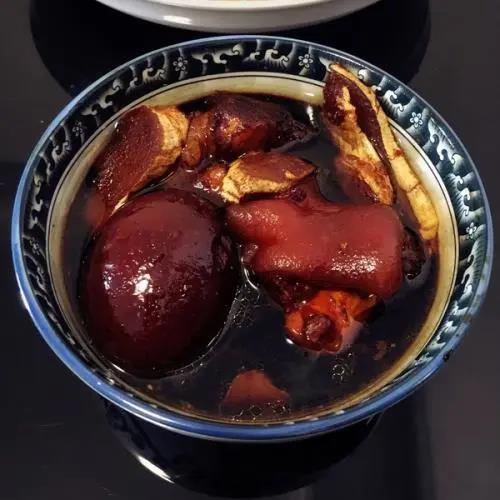 (7)加入豬腳、雞蛋、紅糖,大火煮開轉中小火繼續1小時,熄火。