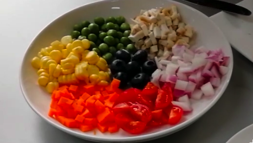 接下來,鋪上我們準備好的果蔬丁。這裏要注意,每個顏色要間隔開來。